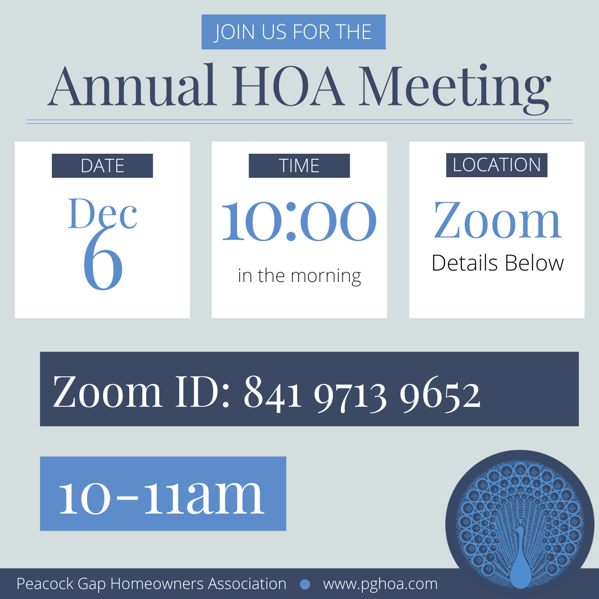 Join us for an update on what’s been happening within the HOA and to share your ideas about making our neighborhood even better. Our meeting will be held via zoom for maximum participation.